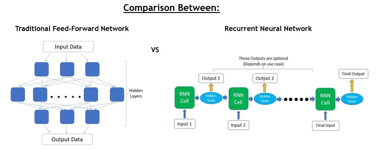 What exactly are RNNs? First, let’s compare the architecture and flow of RNNs vs traditional feed-forward neural networks.