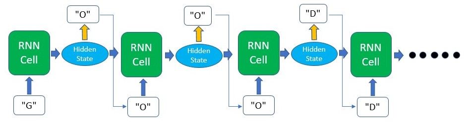 The model will be fed with a word and will predict what the next character in the sentence will be. This process will repeat itself until we generate a sentence of our desired length.