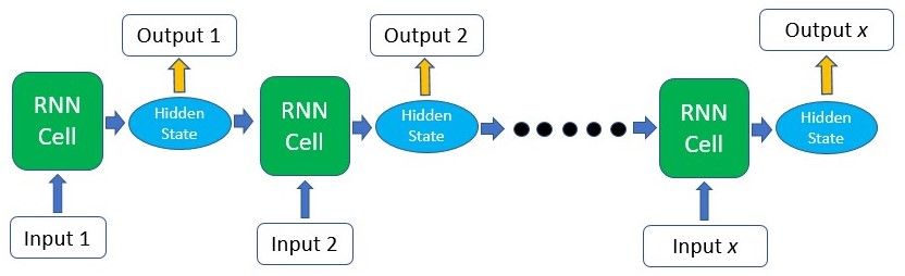 \[\text{output}_t = \text{weight}_{output} * \text{hidden}_t\]The hidden state that we just produced will then be fed back into the RNN cell together with the next input and this process continues until we run out of input or the model is programmed to stop producing outputs.