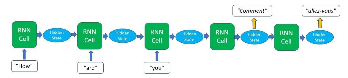 Of course, the type of output that you can obtain from an RNN model is not limited to just these two cases. There are other methods such as Sequence-To-Sequence translation where the output is only produced in a sequence after all the input has been passed through. The diagram below depicts what that looks like.