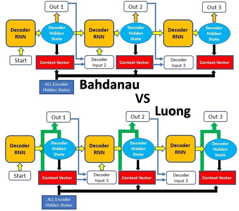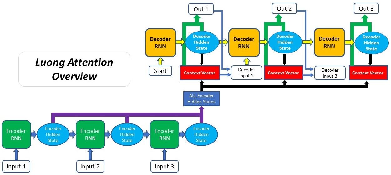 - Decoding the Output - the context vector is concatenated with the previous decoder output and fed into the Decoder RNN for that time step along with the previous decoder hidden state to produce a new output