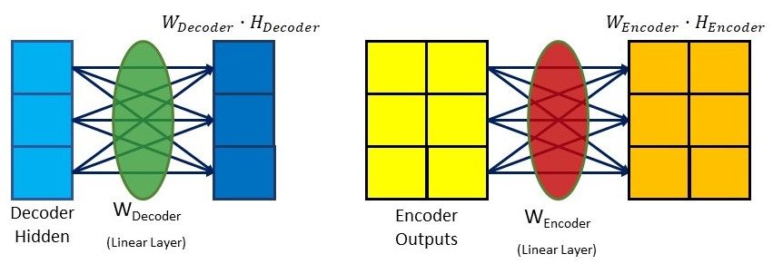 \[score_{alignment} = W_{combined} \cdot tanh(W_{decoder} \cdot H_{decoder} + W_{encoder} \cdot H_{encoder})\]The decoder hidden state and encoder outputs will be passed through their individual Linear layer and have their own individual trainable weights.