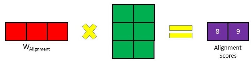 Lastly, the resultant vector from the previous few steps will undergo matrix multiplication with a trainable vector, obtaining a final alignment score vector which holds a score for each encoder output.
