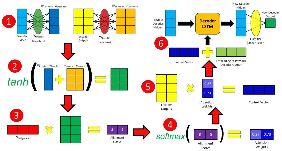 - Softmaxing the Alignment Scores - the alignment scores for each encoder hidden state are combined and represented in a single vector and subsequently softmaxed