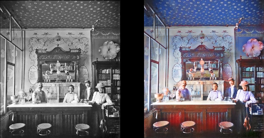 Image colorized by DeOldify: “Interior of Miller and Shoemaker Soda Fountain, 1899”
