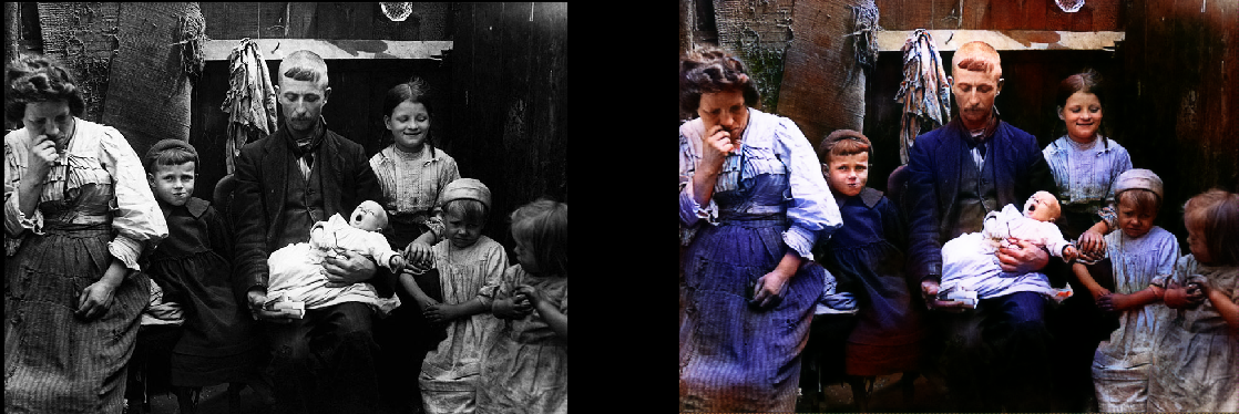 Image colorized by DeOldify: “Poverty in London, 19th century”. The color blue is probably used a bit too much here to be believable.