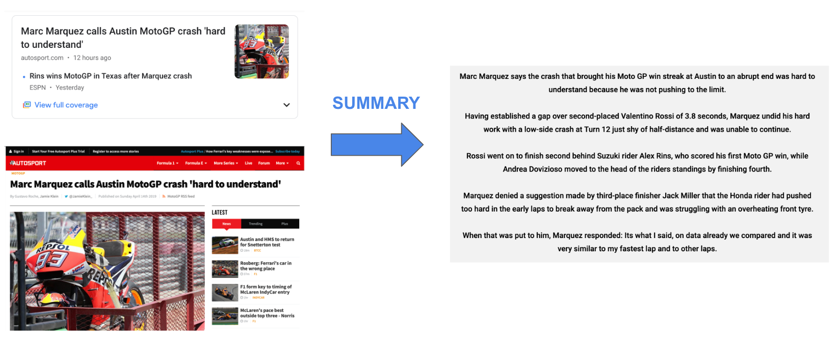 Machine learning algorithms can be trained to comprehend documents and identify the sections that convey important facts and information before producing the required summarized texts. For example, the image below is of this news article that has been fed into a machine learning algorithm to generate a summary.