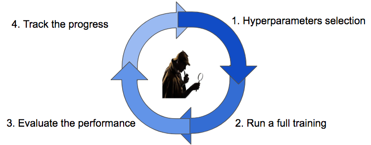 The end-to-end workflow is really quite simple: a student devises a new experiment that she follows through all the steps of the learning process (from data collection to feature map visualization), then will she iterates sequentially on the hyperparameters until she runs out time (usually due to a deadline) or motivation.