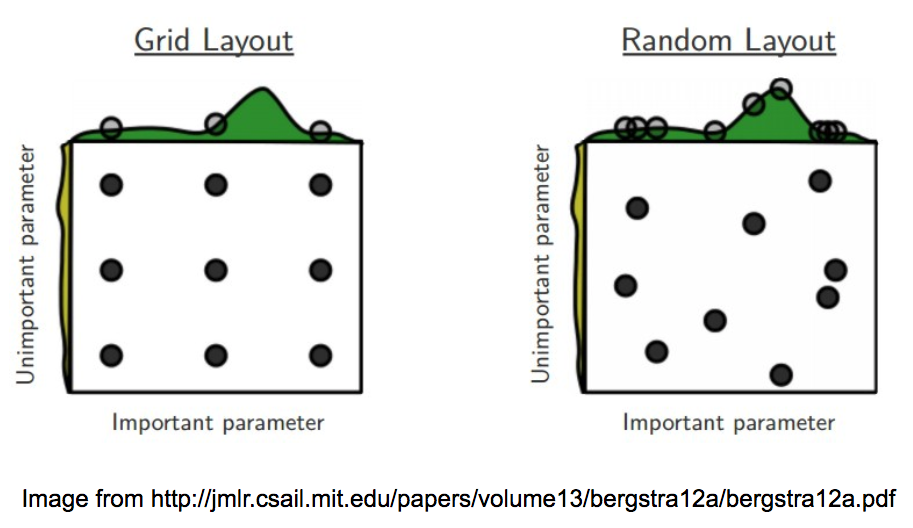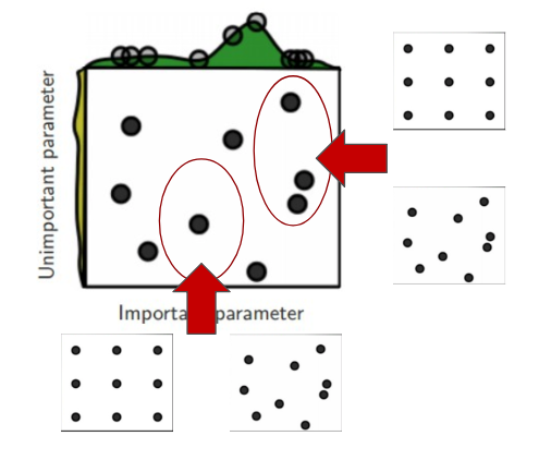 The image compares the two approaches by searching the best configuration on two hyperparameters space. It also assumes that one parameter is more important that the other one. This is a safe assumption because Deep Learning models, as mentioned at the beginning, are really full of hyperparameters, and usually the researcher / scientist / student knows which ones affect the training most significantly.
