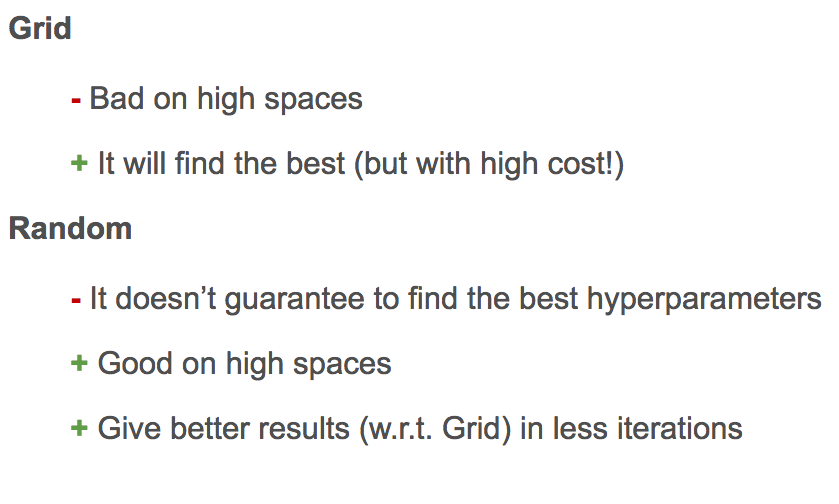 - Search for all the possible configurations and wait for the results to establish the best one: e.g. C1 = (0.1, 0.3, 4) -> acc = 92%, C2 = (0.1, 0.35, 4) -> acc = 92.3%, etc…