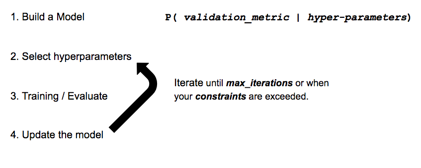 Everything starts with a guess (step 1) of a promising configuration, then we will need to wait until a full training (step 2) to get the actual evaluation on the metric of interest (step 3). We’ll track the progress of the searching process (step 4), and then according to our searching strategy, we’ll select a new guess (step 1).