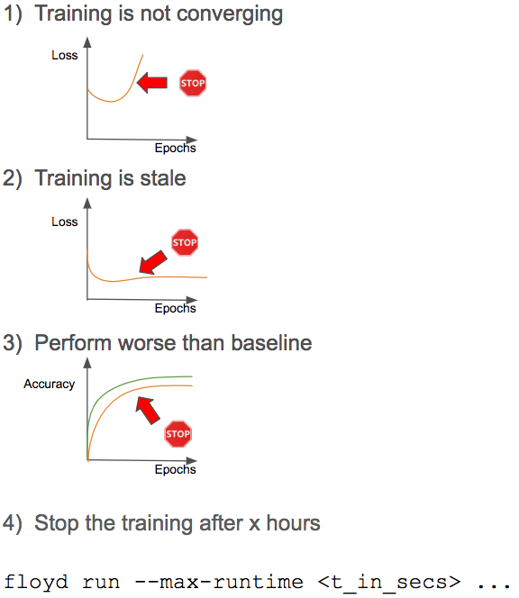 These criteria can be applied manually when babysitting the learning process, or you can do even better by integrated these rules in your experiment through the hooks/callbacks provided in the most common frameworks: