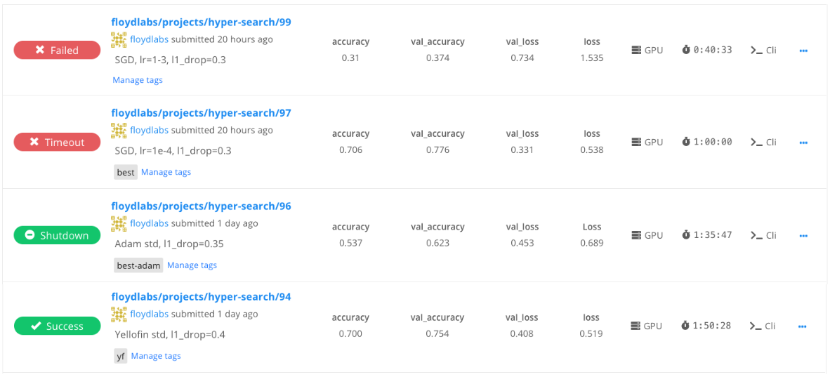 (the software used by our users to communicate with FloydHub and that we’ve open-sourced on Github) provides a flag with this purpose: our power users are using it massively to regulate their experiments.