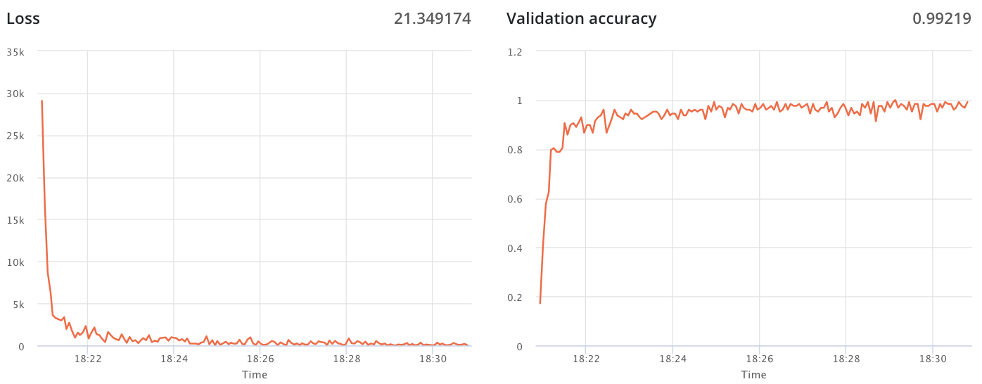 As mentioned above, you can easily emit training metrics with your jobs on FloydHub. When you view your job on the FloydHub dashboard, you’ll find real-time charts for each of the metrics you’ve defined.