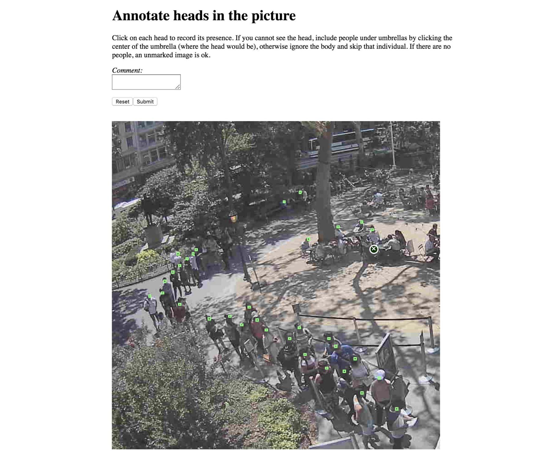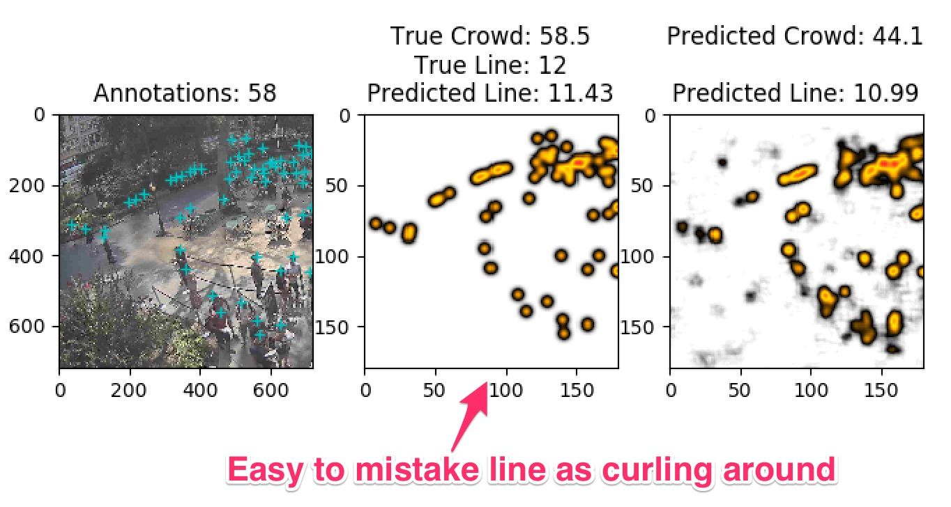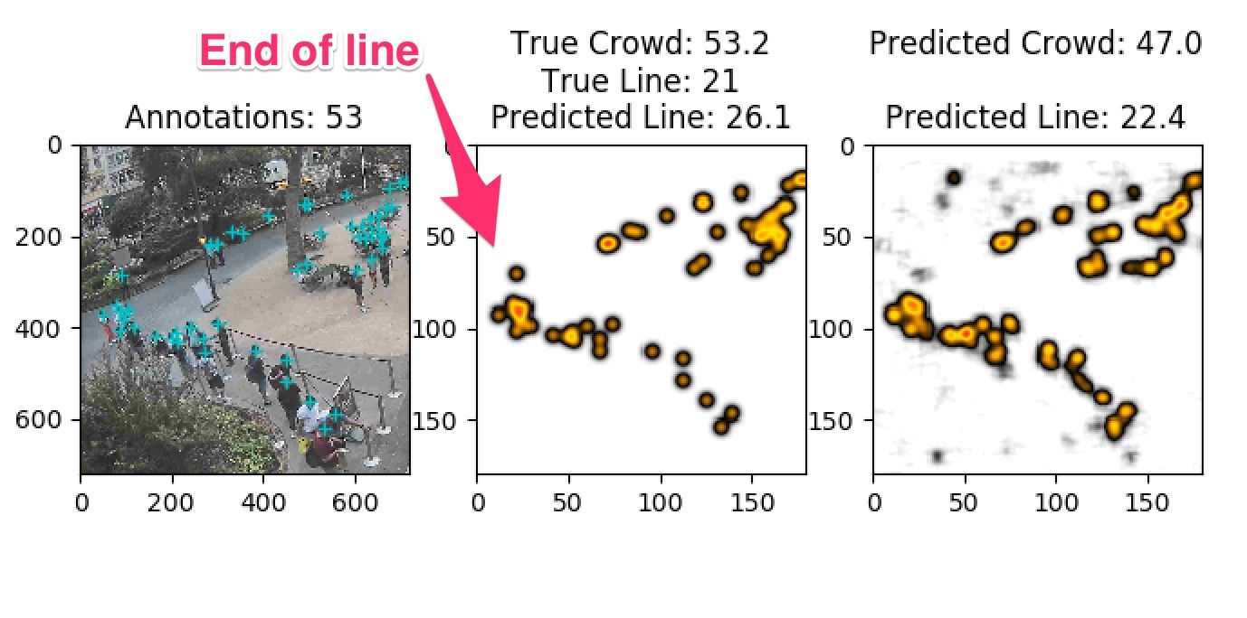My app Count creates a heatmap of heads where 1.0 is present and 0.0 is absent, then adds up all the pixels in the image to get the total size of the crowd. From this crowd, it figures out how many people are actually waiting by seeing which dots make up a solid line, and only counts those pixels.