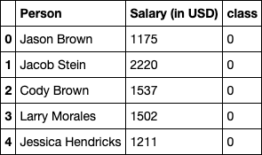 We will first assign all the entries to the class of 0 and then we will manually edit the labels for those two anomalies. We will keep these class labels in a column named class. The label for the anomalies will be 1 (and for the normal entries the labels will be 0).