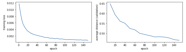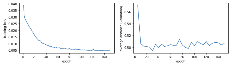 As described above, we train the model like a standard supervised learning problem, for 150 epochs. Every 5 epochs, we also compute the “average distance” metric described above using the validation set (ideally, we’d do it after every epoch, but this is a fairly expensive operation), and save a copy of the model’s parameters. At the end of training, we keep the copy of the model with the lowest mean distance as the final model.