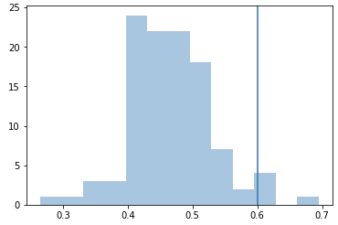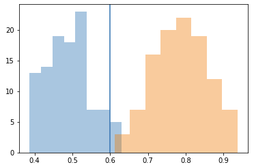 But before we can compute what percentage of distances fall below a threshold, we need to decide what the threshold even is. This, in practice depends on your face recognition system; even systems using the same embedding network can use different thresholds (a casual photo album app may use 0.7, while a door lock may use a much lower threshold such as 0.4). What matters more for the experimentation here is that you remain consistent with the threshold across different runs and changes.