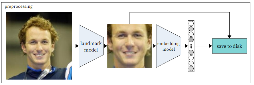 So we first preprocess the images into frontalized images, running them through a basic face detector first, then running a landmark detection model on them. If we can obtain the location of the face landmarks (eg. tip of the nose, points on the jaw), we can warp the image to an “average” pose, frontalizing it. We then further pass them into an embedding network. We save both the frontalized face photo, and its associated embedding to disk. This data generation step needs to be run only once.