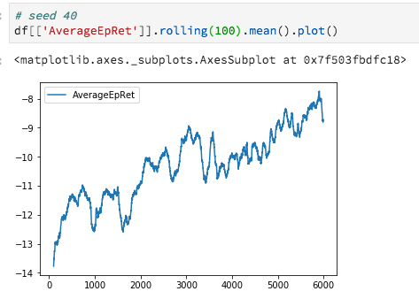 Basically, we’re doing something similar to what we were doing previously in Keras (i.e. training the same neural network with a simple policy gradient algorithm), without having to code anything, directly from the command line!