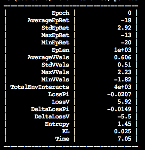 It is taking more episodes to train than our Keras model (we reached the same result in only ~2000 episodes). However, we’re using an out-of-the-box “vanilla policy gradient” from the “Spinning Up” repository, and there is no ad hoc pre-processing required.