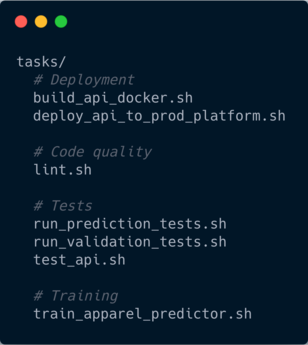 This is where all the convenient scripts for the project will go. This includes tests for checking code quality, tests for model’s predictions, deployment jobs, training jobs etc.