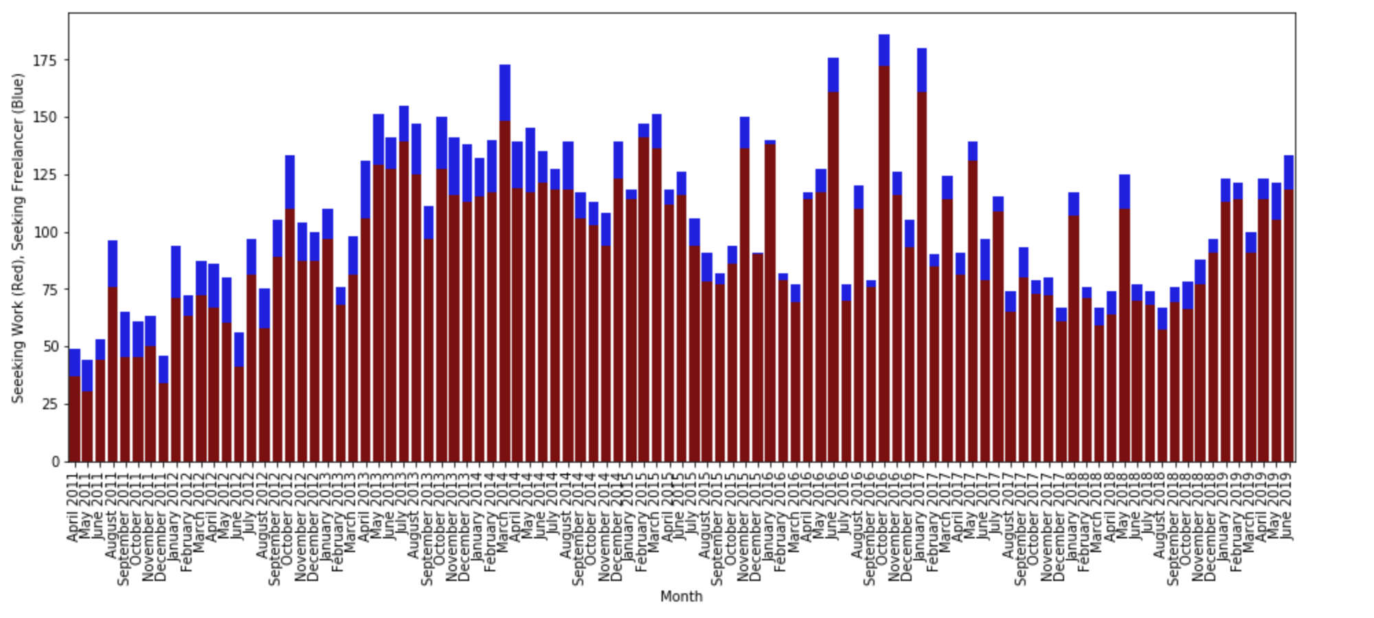 However, for the freelancer post, we want to differentiate between freelancers looking for work and gigs available for freelancers, so we color-code the chart according to the y axis. The chart shows that the people seeking work far exceed the gigs posted, and the thread’s growth over time is not as clear as the hiring thread.