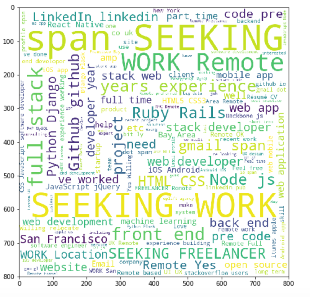 Finally, all of this keyword search has me interested in the most common words used in these threads. Remember, the hiring thread is a dataset of almost 8 million words and the freelance thread has nearly 1 million. However, many of these words are going to be common stop words like “the” or “and”, as well as leftover html syntax like “” or “<p>”. After filtering those out, we can generate word clouds to visualize the frequent words.