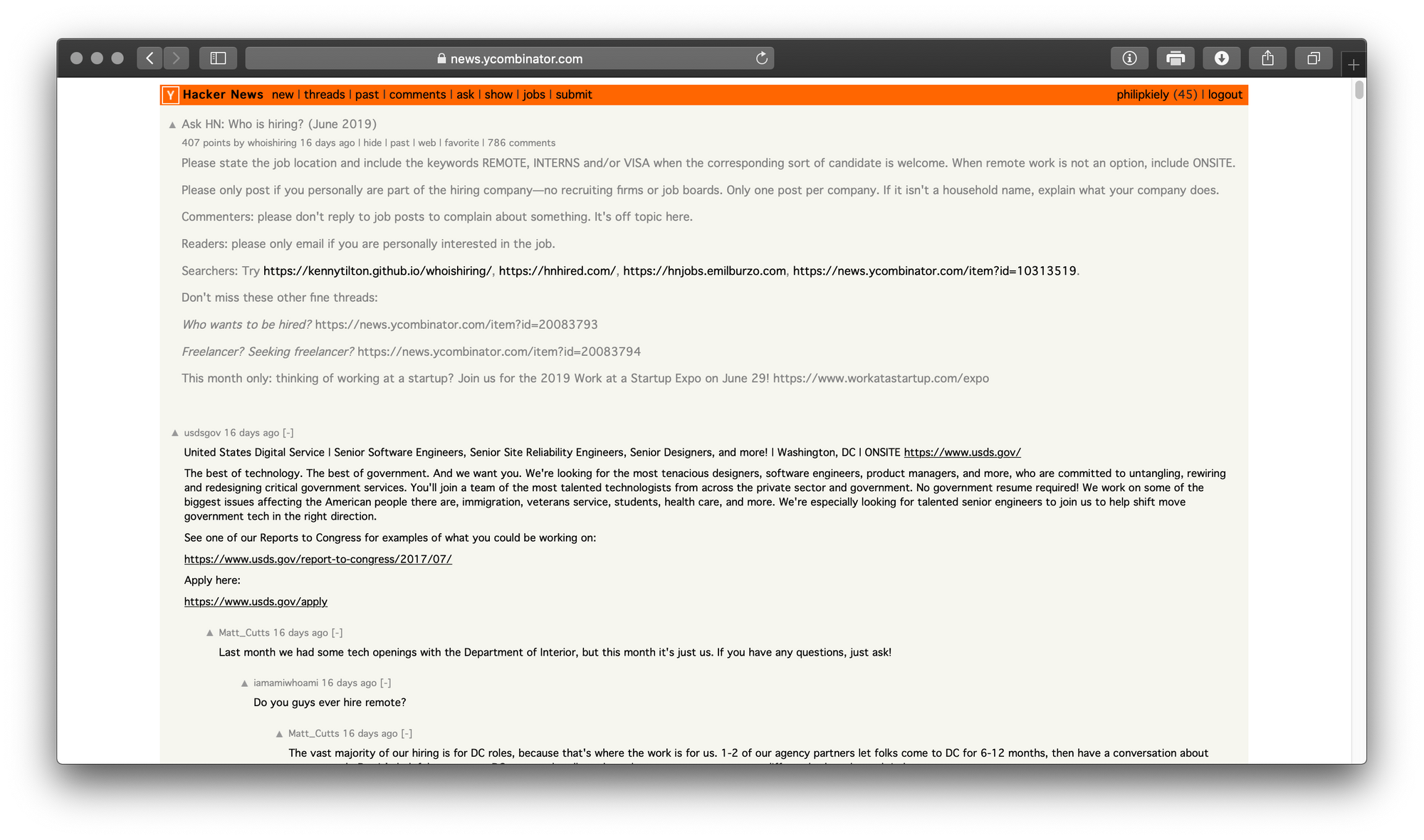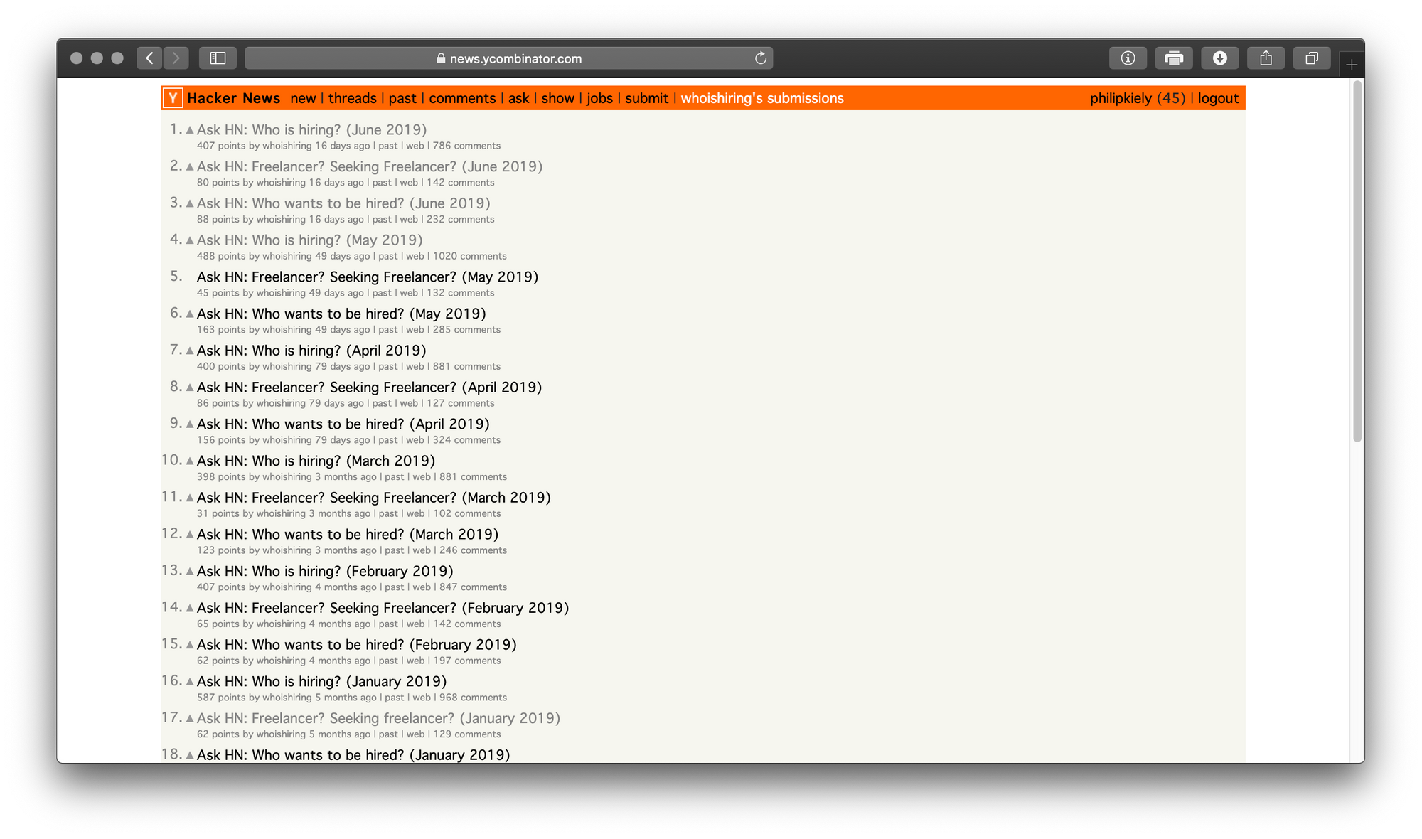Today, we will scrape Hacker News. Specifically, we will gather data from the monthly “Who is Hiring” and “Freelancer? Seeking Freelancer?” threads from April 2011 through June 2019. Hundreds of people per month post opportunities on these threads (it’s how I found out about writing for FloydHub). This is a good set for practicing web scraping because we are considering a number of similar, highly structured pages, but there are still complications like extracting parent comments and following “more” links. Our resultant corpus will be fairly small, we will have two csv files with about 100 rows each.