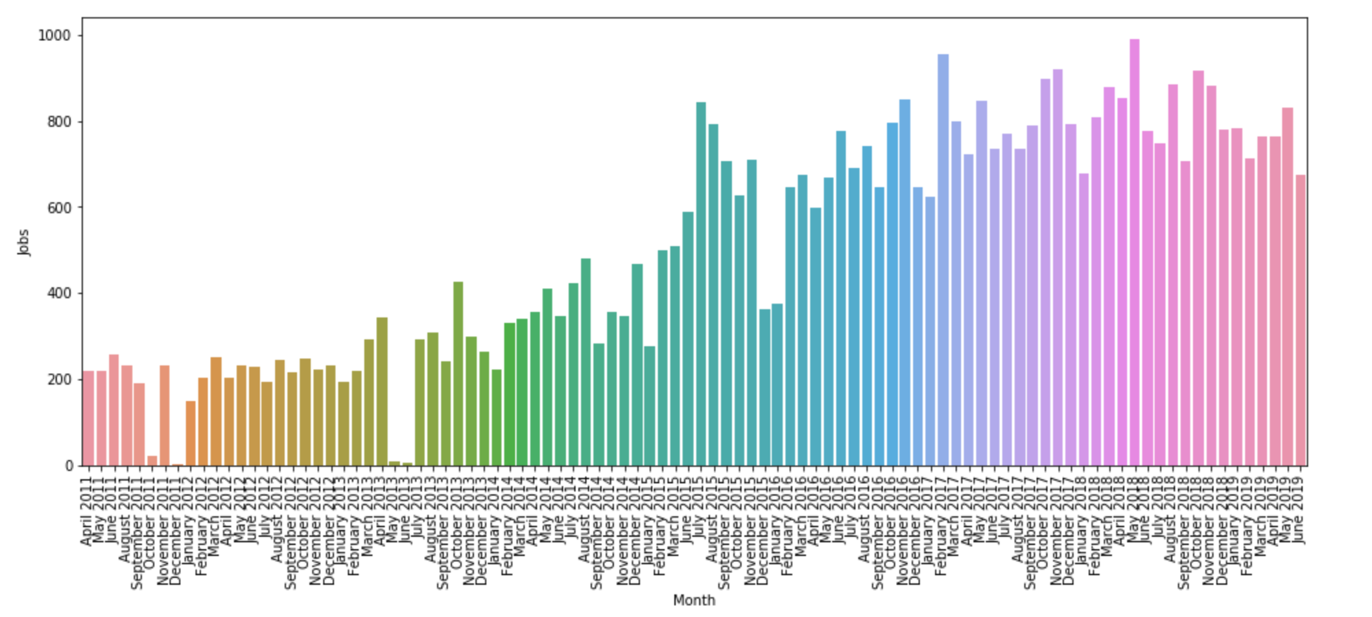 We now have our own formatted data set, something we could not have just downloaded from a repository. We will use this data that we have collected to gain insight into hiring trends on hacker news.
