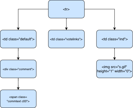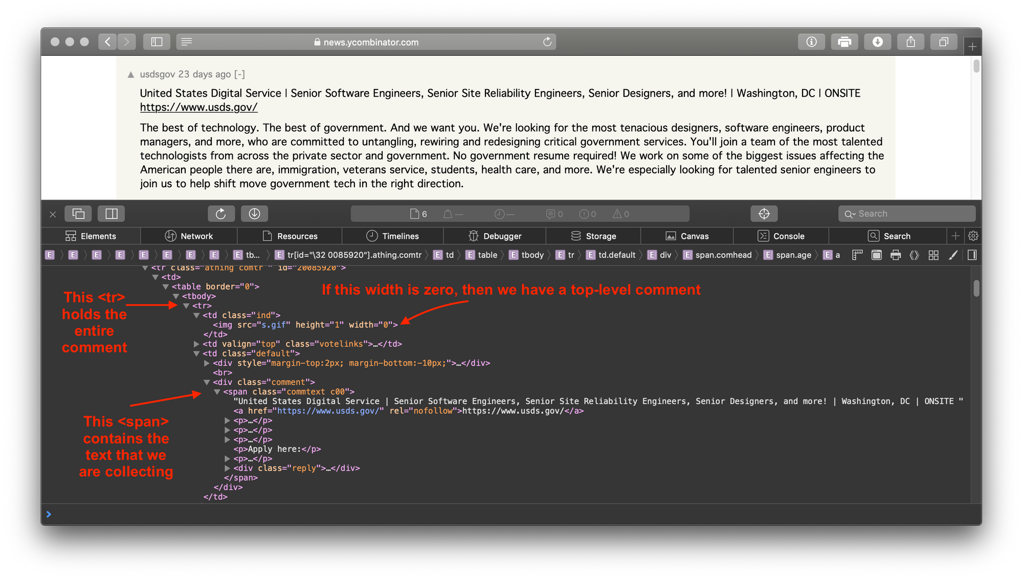 Now that we have two arrays of webpages, we can extract the data from the pages themselves. One important consideration is that we only want top comments, as they are the actual job postings, so we have to examine the structure of a hacker news comment carefully to determine how to tell top comments from child comments. Hacker news is an older website that still uses a table-based layout, nesting several tables to give the desired placement of elements on the page. Within a comment, we have the following structure.