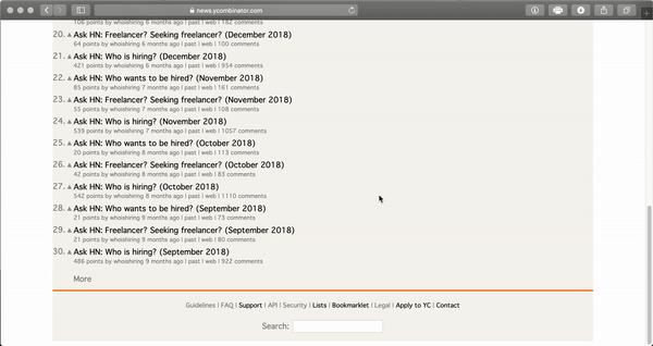 This is a two-stage scrape. We start by finding the actual pages that we will scrape, then we scrape them. Finding the pages requires navigating through the post history of the user “whoishiring.” We start by visiting https://news.ycombinator.com/submitted?id=whoishiring and notice that the posts are paginated. Paginating is the strategy of breaking up a large amount of data, in this case a couple hundred links, over multiple pages for a better user interface and faster load times. To overcome this pagination, we keep an eye out for the “More” link at the bottom of the page, and follow it until we get to the last page, a strategy we will revisit for the posts themselves.