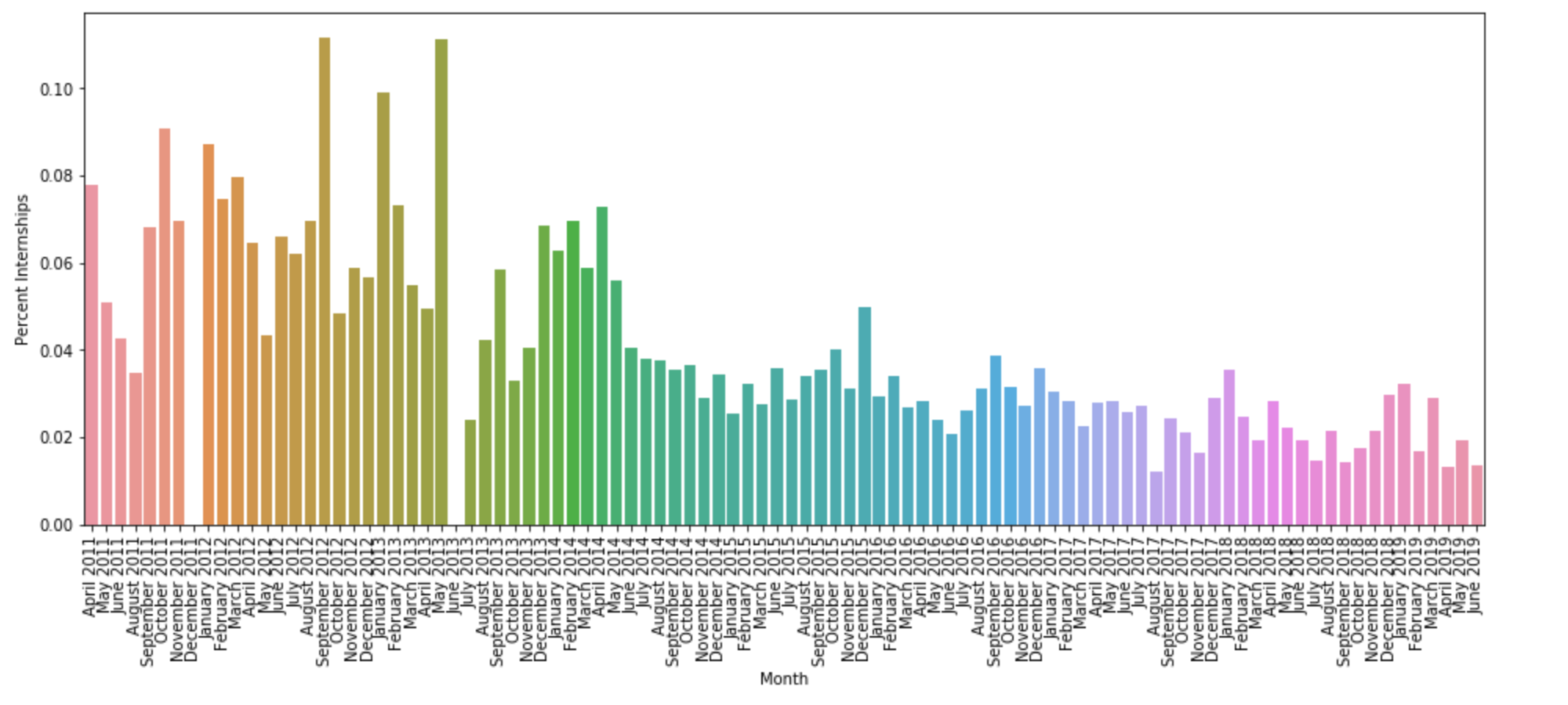 We can perform a similar keyword search for “intern”. In this case, “intern” has more common false positives like “internal”, so we filter to “intern “ and “interns “, both with a space, and accept the increased potential for false negatives. Internship availability has fluctuated over time. I was hoping to identify a clear annual cycle, but the data does not support any such claim.